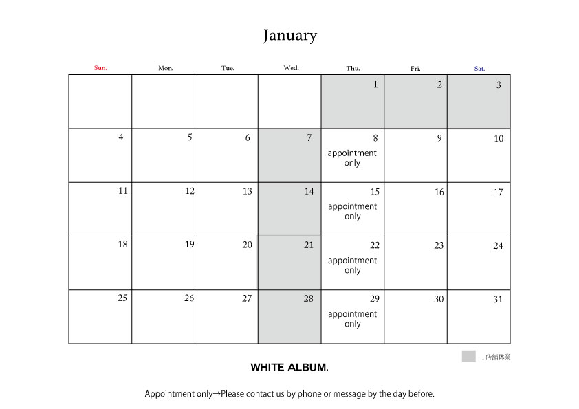 基本的に水曜日は定休日、木曜日はアポイントメント営業となります。